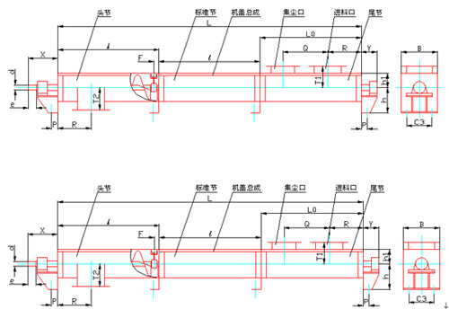 中的運送_是一種滑移運動,為了使螺旋軸處于較為有利的受拉狀態,設計時將驅動裝置和出料口安裝在輸送機的同一端,把進料口放在尾部附近。